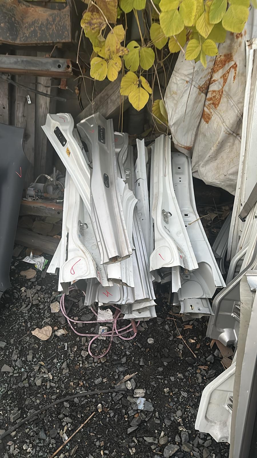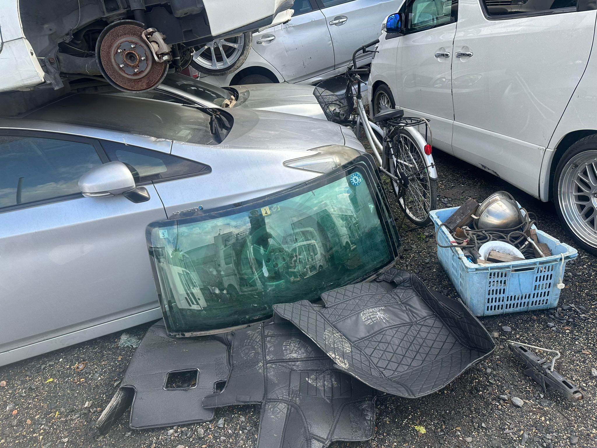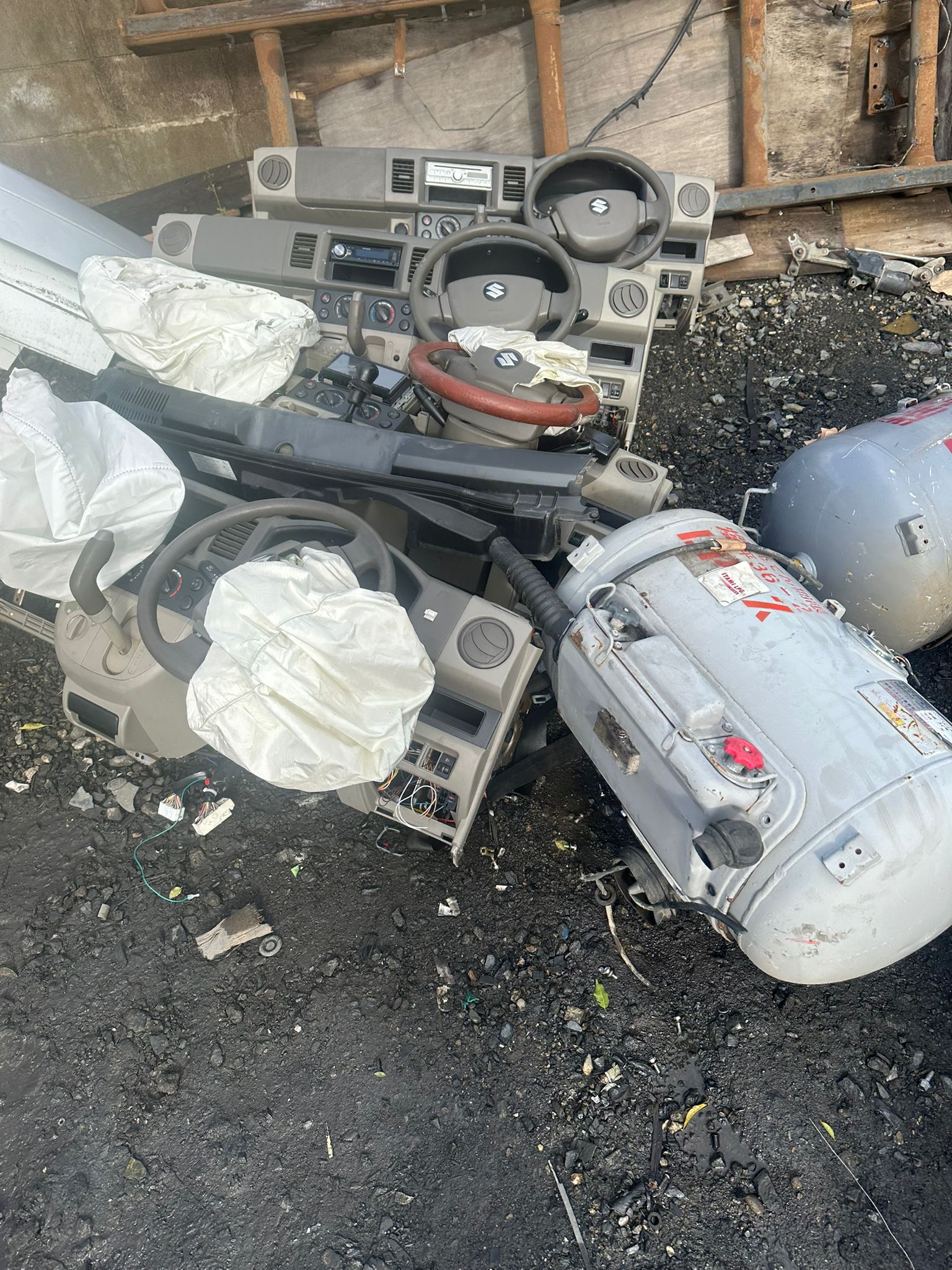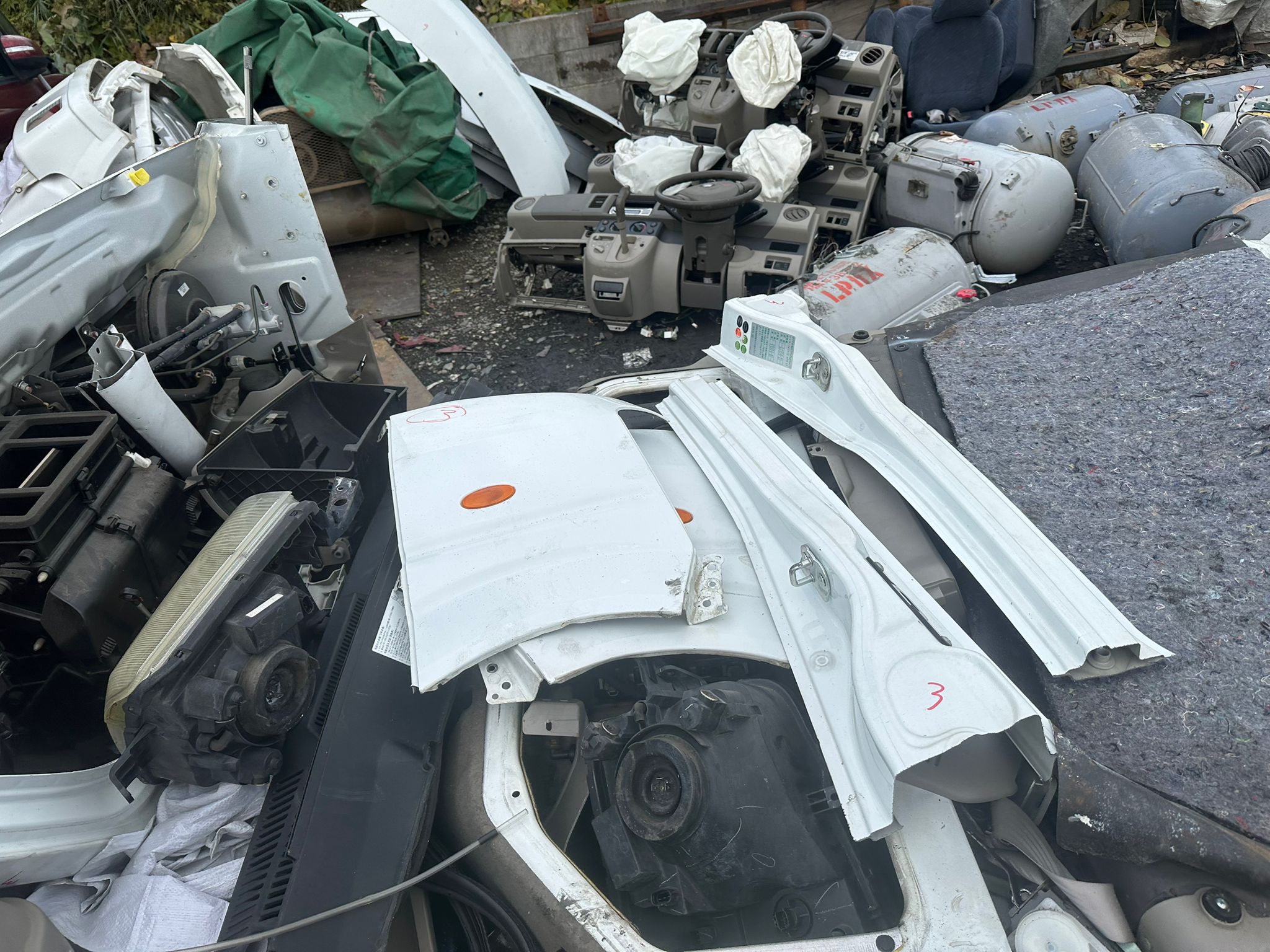 Engines, axles, and panels arranged systematically for easy reassembly.